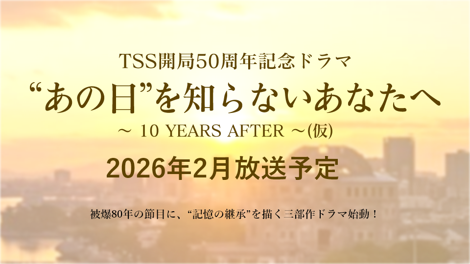 NOW OA 【警報・注意報】が発令されています 【地震速報】 弊社イベントにおける景品表示法違反について 1/2 テレビ新広島人権方針及びフジテレビ事案を踏まえた社内調査について 2/2 今年、わたしたちは開局50年。「またTSSがなんかやってるよ」なんて笑われて喜んじゃうような、そんなやんちゃな遊び心を、これからも。いつまでも。あなたのそばで。 10月18日(土) 午前11時20分 釣りごろつられごろ 秋の夜長を楽しむ! アオリイカのエギング ~山口県・周防大島~ 10月18日(土) 午後5時 西村キャンプ場【謎の撮影班乱入!極厚牛サンド】 【放送7年目突入!感謝を伝えるキャンプ旅】竹原市で洋食店を営むご夫婦の自家製スイーツに感動!キャンプ地では西村が謎の撮影班に見守られ「峠下牛」豪華肉サンドを作る!しかしまさかの大失態が!?翌日、大崎上島町グラウンドゴルフで超絶ムダな奇跡も起こす! 10月18日(土) よる6時30分 全力応援 スポーツLOVERS カープでの現役生活を終えた上本崇司さんが生出演!常にファンを笑顔にしてくれた、野球生活を振り返ります!レジーナ&ドラフラ速報や番組推しを紹介する新コーナーも! 10月18日(土) 深夜1時45分 日向坂46 竹内希来里の地元できらる 今回は特別編!日向坂46ARENATOUR2025「MONSTERGROOVE」in広島で竹内が自らカメラを回したバックヤードの模様をお届け!石塚瑶季さん清水理央さんがじもきらに初登場!小西夏菜実さんも「揚げもみじ饅頭」を堪能! 10月20日(月) あさ9時50分 ひろしま満点ママ!! 「月曜リサーチ知っとった?」は得する整理&収納テクニック!冷蔵庫の整理術・家事の時短・食品ロスの削減方法など役立つ情報をお伝え▼今週のお天気 10月20日(月) 午後3時42分 TSS ライク! 事件、事故、災害情報はもちろん、生活に役立つ経済情報から身近な地域の話題まで。広島に根差した「一日まるわかりニュース」をお届け▼広島天気予報 被爆から80年という時の流れの中で、現代を生きる若者たちが、広島に刻まれた記憶とどのように向き合い、次の世代に語り継いでいくべきか-その葛藤や戸惑いを丁寧に描く 日々、目まぐるしく変化している世の中…プロのファイナンシャルプランナーがお金に関するあれこれを初心者の方にも分かりやすく解説します! 【急募】報道部ではアルバイト・パートを募集中です!メディア業界へ興味のある方は是非! 10月18日(土) よる7時 新しいカギ校内疾走!名曲大好き土八先生2時間SP!映画ドラマ主題歌で早押し対決 左から)菊田竜大、秋山寛貴、岡部大、長田庄平、松尾駿、せいや、粗品 今回は「名曲大好き!土八先生」をお届け!せいやがホストを務め、生徒とカギメンバーで昭和・平成の名曲早押しクイズ!教室で校内放送を聞き、知っている曲が流れたら教室を飛び出し、解答ボタンを目指して校内を駆け抜ける!果たして勝つのはどちらか!? 10月18日(土) よる9時 土曜プレミアム・ものまね紅白歌合戦!今夜限りの史上最強ランキングスペシャル 左から)原田泰造、井上清華(フジテレビアナウンサー)、名倉潤、堀内健 今回は「今夜限りの史上最強ランキングスペシャル」と題し、番組の52年の歴史を振り返る!当時話題となった懐かしのものまねや超豪華ご本人登場など、秘蔵映像を一挙に蔵出しし、ランキング形式で紹介!ものまねオールスターによる豪華メドレーも!お楽しみに! NEW 次回#11は11/10(月) 放送予定 450年の時を超え 広島城によみがえる!「安芸ひろしま武将隊」その秘密を探る【ひろしま棚さんぽ】 10/17(金) 20:00 暮らし・生活情報 【広島の天気】秋の運動会シーズン週末は… 10/18(土)午後から少しずつ雨→19(日)雲主体の天気 10/17(金) 19:28 暮らし・生活情報 ベトナム人女性殺害事件 死因は「頭蓋骨骨折による出血性ショック」犯人に強い殺意か 広島 10/17(金) 19:25 ニュース 特殊詐欺の海上自衛隊員(27)送検 息子の代理を装い女性から100万円を騙し取った容疑 広島・福山市 10/17(金) 19:00 ニュース 新天地公園で知人男性の頬をハサミで切りつけた疑い 男を殺人未遂容疑で逮捕 酒に酔っていたか 広島 10/17(金) 18:58 ニュース 「ちゃんと説明がつかない」別居中の妻の頭を斧で複数回殴った疑い 夫(48)を殺人未遂容疑で逮捕 広島 10/17(金) 18:56 ニュース 県知事選を前に 「選挙の七つ道具」を点検 ルールを守って明るい選挙を 23日公示 来月9日投開票 10/17(金) 18:46 ニュース 広島大学 呉市に『海洋・海事未来研究所』を開設 「海の持続的 平和な利用に貢献する人材を」 10/17(金) 18:44 暮らし・生活情報 都市部でも県立高校の統廃合を検討 対象は1学年4学級下回る場合 来年1月に再編案を提示 広島県 10/17(金) 18:37 暮らし・生活情報 リアル「犬のおまわりさん」!?ワンちゃんがお散歩しながら防犯パトロール「ワンパト隊」が発足 広島 10/17(金) 18:34 暮らし・生活情報 【広島あの日のきょう】オリエント急行がやってきた(1988年)ヨーロッパの歴史ある豪華列車が日本一周 10/17(金) 18:28 暮らし・生活情報 ひろしま週末イベント情報 尾道市「尾道灯りまつり」大竹市「大竹祭」 10/17(金) 18:26 暮ら