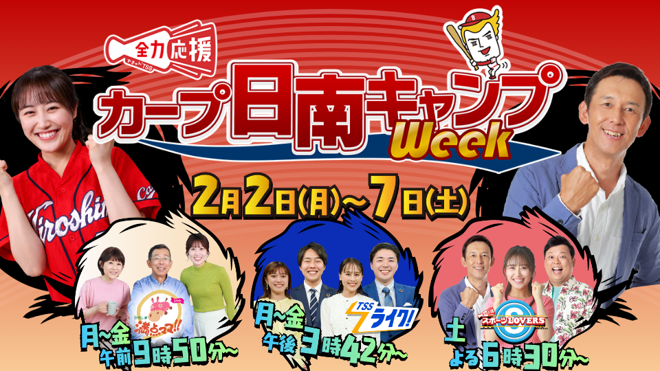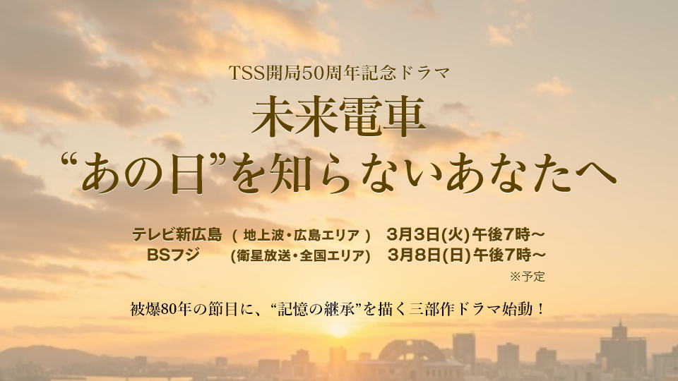 NOW OA 【警報・注意報】が発令されています 【地震速報】 テレビ新広島人権方針及びフジテレビ事案を踏まえた社内調査について 今年、わたしたちは開局50年。「またTSSがなんかやってるよ」なんて笑われて喜んじゃうような、そんなやんちゃな遊び心を、これからも。いつまでも。あなたのそばで。 1月29日(木) あさ9時50分 ひろしま満点ママ!! 「地元っこに聞いてみた」は広島市佐伯区楽々園!昭和の貴重な映像やレトロ感満載の缶バッジ・小学生が通う税理士事務所が登場!伝説のご近所さんでは世界レベルの特技を披露! 1月29日(木) 午後3時42分 TSS ライク! 事件、事故、災害情報はもちろん、生活に役立つ経済情報から身近な地域の話題まで。広島に根差した「一日まるわかりニュース」をお届け▼広島天気予報 被爆から80年という時の流れの中で、現代を生きる若者たちが、広島に刻まれた記憶とどのように向き合い、次の世代に語り継いでいくべきか-その葛藤や戸惑いを丁寧に描く あつあつの湯気!美しい黄金色!ホクホク、ねっとり!甘さがたまらない!さいまいも好きが存分に満喫できるフードフェス!さまざまな品種の焼きいもの食べ比べや、進化するさつまいもグルメ&スイーツを一挙に集め、全国各地から選りすぐりの人気店が16店舗集結! 全国で活躍しているファイナンシャルプランナーの先生によるマネーセミナーを開催します。資産形成、最近よく聞く新NISAやiDeCo、住宅ローン、保険のことまで、幅広く解説してくれます。 戦争の悲劇を風化させず、平和の大切さを若い世代につなげていく―。その私たちの思いを「記憶にも記録にも残す」形にするために、広島の学生たちとともにギネス世界記録に挑戦します。 就活生のためのオフィスツアーを1月&2月に開催!ただいま応募受付中!2月開催分は2/9(月)ひる12:00締切です 2026年シーズンの開幕へ向け、鯉戦士たちが日南にキャンプイン!2月2日(月)~7日(土)の間、TSSの番組で選手のインタビューや練習風景など、カープ日南春季キャンプの模様を現地からお届けします。 【急募】報道部ではアルバイト・パートを募集中です!メディア業界へ興味のある方は是非! 1月29日(木) よる7時 ミュージックジェネレーション【気合が入る名曲SP】 左から)井上清華(フジテレビアナウンサー)、福本莉子、弓木奈於(乃木坂46)、藤田ニコル、瀬戸朝香、さまぁ~ず(大竹一樹、三村マサカズ)、小森隼(GENERATIONS)、長谷川忍(シソンヌ) 「気合が入る勝負曲」スペシャル!MCはさまぁ~ず(大竹一樹、三村マサカズ)。ゲストは、令和世代・初登場の福本莉子、藤田ニコル、弓木奈於(乃木坂46)、平成世代・小森隼(GENERATIONS)、長谷川忍(シソンヌ)、昭和世代・瀬戸朝香が登場。 1月29日(木) よる8時 この世界は1ダフル★ミラノ・コルティナ五輪直前!1万人が選ぶ冬季五輪名場面SP 松下奈緒 ミラノ・コルティナ2026冬季オリンピック開幕直前!「国民1万人が選んだ、冬季オリンピック心震えた名場面」を、スタジオゲストの松下奈緒、大沢あかね、小島凪紗(櫻坂46)、やす子、河井ゆずる(アインシュタイン)とランキング形式でお届け。 1月29日(木) よる10時 <木曜劇場>プロフェッショナル【いじめ保険】天音の宿敵・氷室貴羽とは #04 左から)岡崎紗絵、玉木宏 借金や人間関係に苦しむ人たちに保険金殺人のプランを提案し、遂行させる……それを楽しんでる悪魔のような女がいる、という噂。そして“いじめ保険”で初めての単独調査に気合いの入る凛(岡崎紗絵)。果たして凛が辿りついた、いじめの実態とは…? TSS×衆議院選挙2026 つたえる つなげる ヒロシマ・ナガサキ被爆80年プロジェクト オバマ元大統領と抱擁した被爆者 森重昭さんが託す思い 「原爆を使う戦争はもう2度とないことを願う」 1/28(水) 20:00 暮らし・生活情報 【解説】「ゾンビたばこ」とは 過剰に摂取で手足の痙攣・錯乱状態に…自分で注文すれば10年以下の拘禁刑 1/28(水) 19:14 ニュース 【クイズ衆院選】こんな行為は選挙違反!? 電子メールで投票呼びかけ、18歳未満の選挙運動 正解は? 1/28(水) 18:44 ニュース 選挙で何に注目する?街の人は…消費税減税には賛否の声「減税はしてほしい」「若い人の負担になるなら…」 1/28(水) 18:34 暮らし・生活情報 【広島あの日のきょう】宮島水族館「立つワニ」が人気(2008年)2本足で直立、なぜ立つのか謎のまま… 1/28(水) 18:06 暮らし・生活情報 在外被爆者訴訟 遺族側が勝訴 国に損害賠償支払い命じる 被爆後帰国したため援護措置を受けられず 広島 1/28(水) 18:02 暮らし・生活情報 八潮市道路陥没事故から1年 広島の消防隊員が研修「老朽下水道管事故」救助の難しさを体感 1/28(水) 17:58 暮らし・生活情報 JR福山駅周辺再整備 基本計画大詰め「南側に広場と路線バス乗り場、北側に観光バス乗り場案」支持多数 1/28(水) 17:54 暮らし・生活情報 『ゾンビたばこ』県内初摘発 足のスペシャリストに何が カープ羽月容疑者逮捕から一夜明け 衝撃広がる 1/28(水) 17:38 ニュース カープ松田オーナー「小さい体でのプレーに勇気づけら