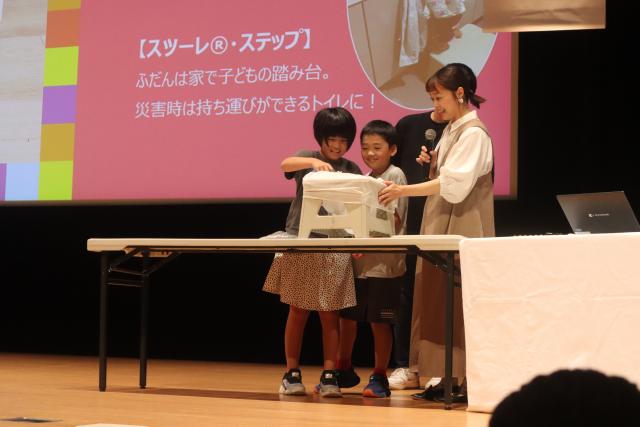 簡易トイレの使い方の実演では、小学生の姉弟とお父さんに協力してもらいました!