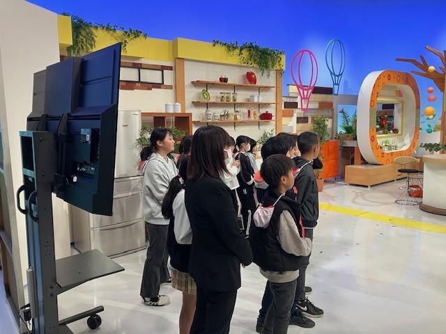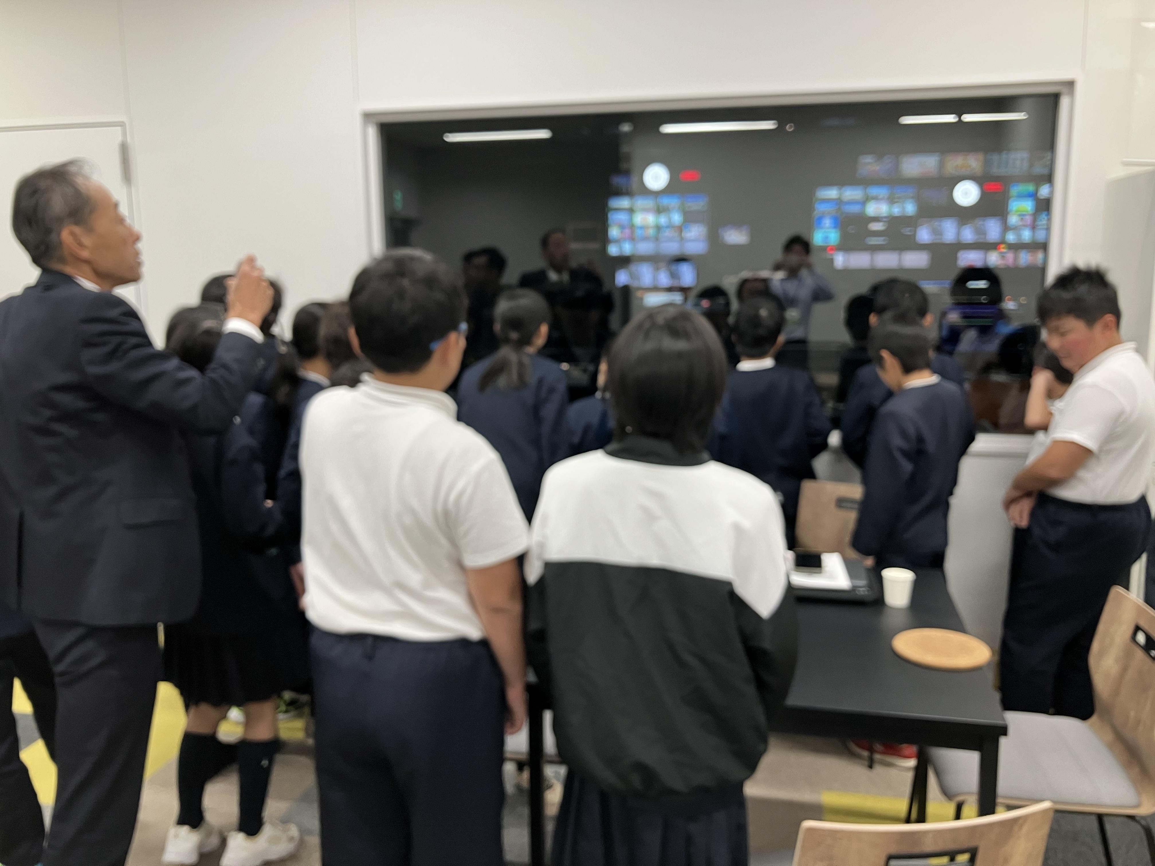 大河小学校5年生3クラス最後の見学です。これまでの見学は水曜日でしたが、今日は火曜日。コーナーが違い、出演者も違います。スタジオ前のロビーでは、先生が「あっ、さいねいさん」と呼びかけ、生徒からは「一緒に写真撮ってもらったことある!」の声。スタジオ前でさいねいさんと少し会話。