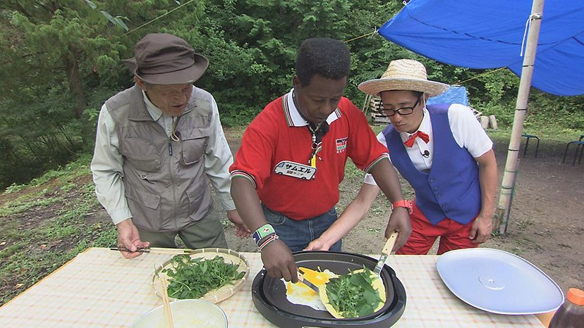 こうして楽しく仙人に教わりながら、日本古来の食べられる野草をたくさん集めることができました!ということで、手に入れた野草を使って万葉時代からあった道具で絶品料理作りに挑戦ですが、その前に竹を使った食器作りにチャレンジ。万葉時代の頃は既に、土、鉄、木といった素材が使われていたということを教えてくれました。竹の箸とコップ作りにも挑戦し、万葉時代からあった材料で、竹の食器を完成させることができましたよ。ここからは料理作りの開始です。万葉時代から油があったということで野草の天ぷら。次にサムエルさんの大好物のお好み焼き。小麦粉の生地の上に野菜ではなく野草をたっぷりとのせましたよ。さらにもう一品、万葉スイーツのお饅頭もつくりました。この後仙人、サムエルさん、柴田と仲良く試食。野草で作った料理はどれも、仙人も驚くほどのおいしさで、みんな感動しました。収録後にはすっかり意気投合したケニア人サムエルさんと仙人西村さん。今度はケニアのご飯を食べてもらいたいので、ケニアに遊びにきてください!とサムエルさんから驚きの一言。