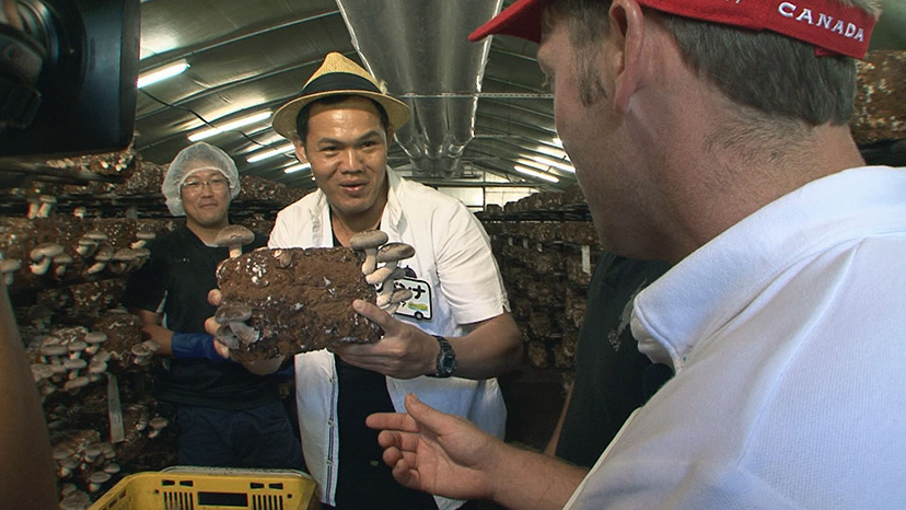 2人を乗せた行きたがリーノ号が到着したのは、椎茸を栽培するフルーツセンター文田。もともとミカンの選果場だったっことから、フルーツセンターという名前が付いているんだそうです。早速、敷地にある椎茸を育てている建物の中を案内してもらいました。そこで栽培されていたのは、菌床しいたけ。原木をチップにし、栄養を加えブロック状にしたものに、椎茸菌を植え付け、徹底した温度管理のもと栽培する椎茸なんです。