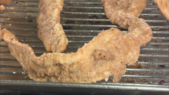 (3)(2)を一晩凍らせ冷凍したまま180℃の油でおよそ1分一気に揚げる。