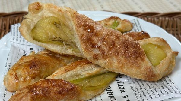 ④ ①のナスの両面に②のバターを塗ってパイ生地に乗せて、グラニュー糖(分量外)を全体に軽く振る。