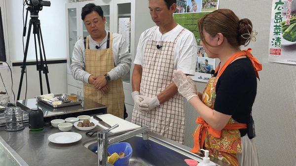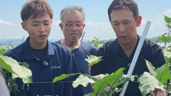 ① 築陽ナスの皮を剥いて、縦長に2mm幅4枚スライスする。 ※余ったナスは味噌汁や天ぷらなどに使用してください。