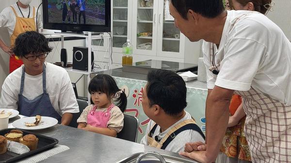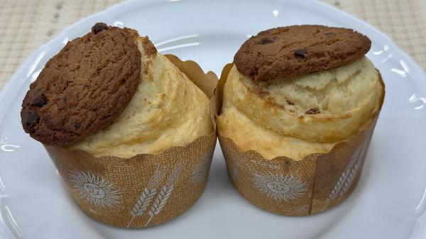 ④ カップケーキの型4つに③を分けて入れ、底に生地がいきわたるようトントンと軽く台に打ったら、チョコチップクッキーをのせて180度に予熱したオーブンで20分焼く。