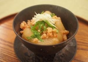 (1)鍋にだし・酒・みりん・砂糖を入れ、一口大に切った大根を入れて中火にかけ、沸騰したら弱中火にし、大根が透き通ってくるくらいまで約30分煮る。