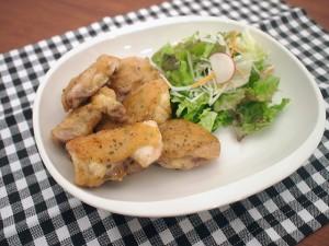 (1)鶏肉は筋や余分な皮を取り、一口大に切る。(およそ1枚で6等分)肉に塩、コショウをし、天板にのせて、オリーブオイルをまわしかけ、180度に予熱したオーブンで17分焼く。