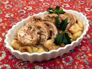 (6)串を真ん中に刺して透明な煮汁が出ればOK。タコ糸を外してカットして再度オーブン皿に戻し、EXVオリーブオイルをかける。ヒイラギの葉を飾り、お好みでマスタードを添えて!