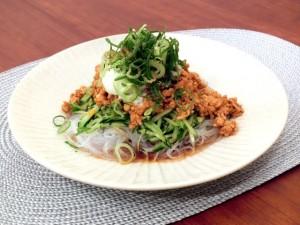 (4)器に春雨を盛り付け、キュウリの千切り・肉みそ・青ネギ小口切りを盛り付けて、中央に温泉卵をのせ、ラー油を回しかけ山椒をふって仕上げる。
