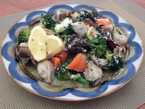 (3)炒め鍋にオリーブオイルとニンニクスライス・赤唐辛子小口切りを入れて熱し、香りが出たらカキを炒める。(2)の野菜も加え、白ワインと塩・コショウ各少々を加えて更に炒めて味を調えて仕上げる。