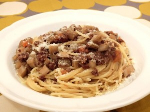 (6)(4)のソースの味を調えて茹で上がったパスタと絡めて、盛りつけてパルミジャーノチーズをかけて完成。