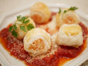 (5) 器に(4)のトマトソースを敷き、焼いたパイを盛り付け、粉チーズをふりかける。
