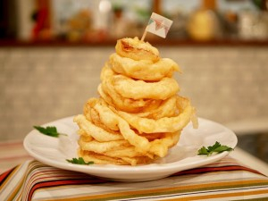 (3)タマネギを衣にくぐらせ、180度に熱した油でカリッとなるまで2、3分揚げる。揚げ上がりに塩を軽くかける。