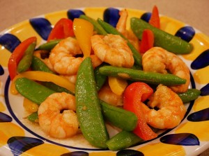 (3)湯を沸騰させてエビをサッと茹でて取り出し、スナップエンドウとパプリカも色が鮮やかになるまでサッと湯通しする。