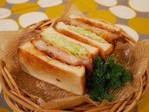 (4)食パンのバターを塗った面に(2)のキャベツの半分を置き、(3)のカツを置き、スプーンでソースを全体にかけて、もう1枚のパンをのせて軽く押さえてなじませて半分に切って盛り付ける。(ラップに包んでしばらく置いても良い。)