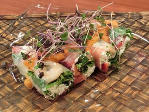 (5)(4)に、生ハム、トマト、エビ、ルッコラ、イタリアンパセリとリコッタチーズを並べ、まず一巻きする。左右をたたみ、向こう側にくるくるとしっかり巻いていく。