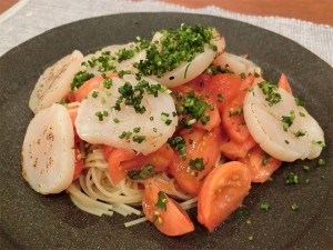 (6)(5)を皿に盛りつけて、(4)のホタテとアサツキを飾って完成です。