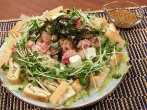 (5)器にレタスをしき、豆腐をおいて中央に(4)を盛り付け、周りに油揚げとかいわれ菜・もみ海苔を散らして、わさびソースを添える。