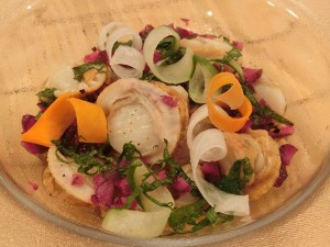 (1)ベビーホタテは半分にカット、しば漬けは小さく刻み、大葉は細く切る。ニンジンとキュウリ大根で飾りのよりニンジン・よりキュウリ、より大根を作る。