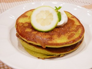 (6)レモンソースを作る。レモン果汁を絞って、ハチミツと合わせる。バターを器に入れてラップをしレンジで20秒ほど加熱し、レモンとハチミツに合わせる。少しバターが固まるが、パンケーキにかける時少し溶かして使う。