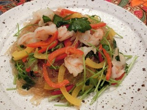 (4)茹であがった(2)の春雨をすぐに(3)のフライパンに加えて炒める。
