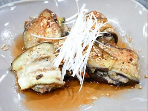●ナスを立て塩につけることでしんなりして巻きやすくなる。