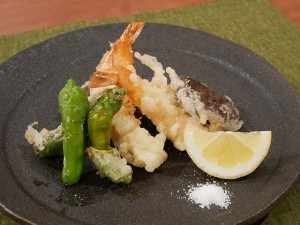 (5)揚げ油を180度に熱して、薄く薄力粉をつけた具材を衣にくぐらせて、エビは泳がせる様に入れて、浮き上がる迄さわらないで揚げる。