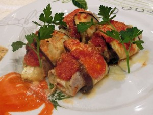 (4)端から巻き込んで爪楊枝で止める。シール容器に並べて、上からトマトソースをかける。