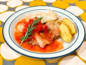 (4)200度に予熱をかけたオーブンで約15分〜18分焼く。焼き上がったらトマト以外を器に盛りつける。