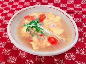 (3)沸騰してシーフードミックスに火が入ったら火を弱める。卵を溶きほぐし、かきたまになるように加える。