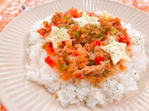 (4)器にご飯を平らに盛り、中央にドライカレーをのせる。星形にカットしたスライスチーズを飾り、パセリを振りかける。