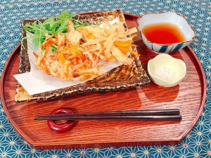 (4)(2)に(3)を加えてさっと混ぜたら、適量を木べらの上に乗せて形を作り、170度の揚げ油にそっと入れる。少し色づくまで揚げたら取り出して油を切って器に盛り、塩や天つゆなどを好みで添える。