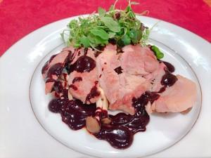 (6)豚肉をカットしてお皿にしめじと豚肉を盛り付け、サラダとチョコレートソースをかけて完成です。
