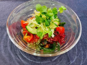 (5)お皿に海藻サラダミックス、ところてんを盛り、上から(4)のソースをかける。