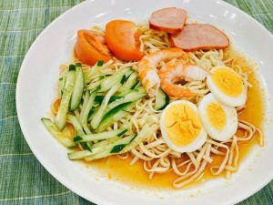 (4)器に麺を盛り、中央にエビをのせ、キュウリ、トマト、ゆで卵、焼き豚をのせてタレをかけて仕上げる。