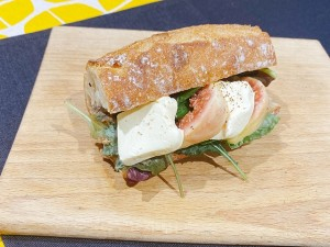 (4)いちじくは1/4カットにして、バゲットは横に切り込みを深めに入れる。そこにサバのリエットをたっぷり塗り、ベビーリーフとルッコラをはさむ。いちじくとクリームチーズを交互に重ね、黒コショウをふる。