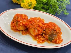 (4)肉巻きおにぎりを取り出したフライパンで新タマネギを炒める。新タマネギがしんなりしてきたら、トマトソースと肉巻きおにぎりを入れて塩・コショウをふる。絡ませるように煮込んだら仕上げにEXVオリーブオイルをかけて盛り付ける。
