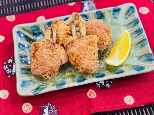 (3)バットなどに片栗粉をいれて、ねかせた手羽先にまぶす。片栗粉をまぶしたら形を整えて、180℃に温めた揚げ油で5分程揚げる。