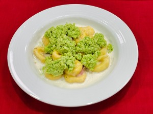 (7)お湯に対して1%の塩を入れたお湯でニョッキを茹でる。ニョッキが浮き上がってきたら、ソースと合わせて皿に盛り付ける。仕上げに(2)の枝豆ペーストをのせる。