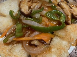 (5)フライパンの油を大さじ1残し、(2)の野菜類を炒め、合わせ調味料を加えて加熱し、水溶き片栗粉でとろみを付け、ゴマ油を回し入れる。