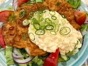 (5) 器にザク切りしたレタス・トマト・キュウリとスライスした赤玉ネギを敷き、食べやすく切ったチキンを盛り、タルタルソースをかけ、青ネギを散らして、残った南蛮だれを野菜にかけて仕上げる。