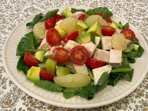 (3) ミニトマトは横半分に切り、アボカドは2cm角に切って塩・レモン汁を少々まぶしておく。グレープフルーツは薄皮を取り、キウイフルーツも2cm角に切る。