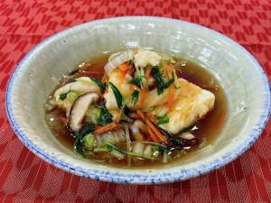 (5)器に(3)を盛り付け、野菜のあんをタップリかけ、おろし生姜を天盛りして仕上げる。