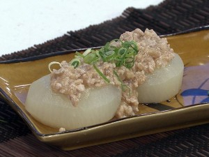 (5)器に大根を盛付けてそぼろ餡をかけたら、お好みでおろしショウガと青ネギをのせる。
