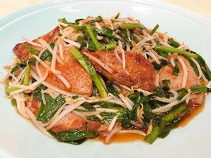 (3)フライパンにゴマ油大さじ1/2入れ、もやしとニラをサッと炒めて取り出しておく。