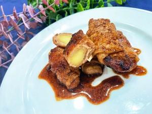 (5)フライパンに残った余分な油をキッチンペーパーで拭きとり、バルサミコ酢、ハチミツ、おろしショウガを加えたらリンゴの豚肉巻きを戻し入れて、煮詰めながら全体に絡めて皿に盛る。