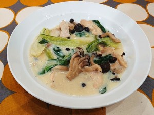 (3)鍋にバターを溶かして鶏肉を焦がさないように炒め、(2)を加えて更に炒め、水とコンソメ顆粒を入れて1~2分煮て、青梗菜の葉を加えてひと煮して、牛乳を加え水溶き片栗粉でトロミを付け、塩・コショウで味を調えて仕上げる。