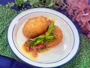 (3)モッツァレラの水分を切ったら半分にカットして、手で平らになるように潰して形成する。