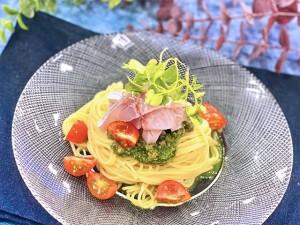 (6)冷たいお皿にスパゲッティを盛り付け、キュウリのソース、アジのマリネをのせたらカットしたミニトマトをちらす。